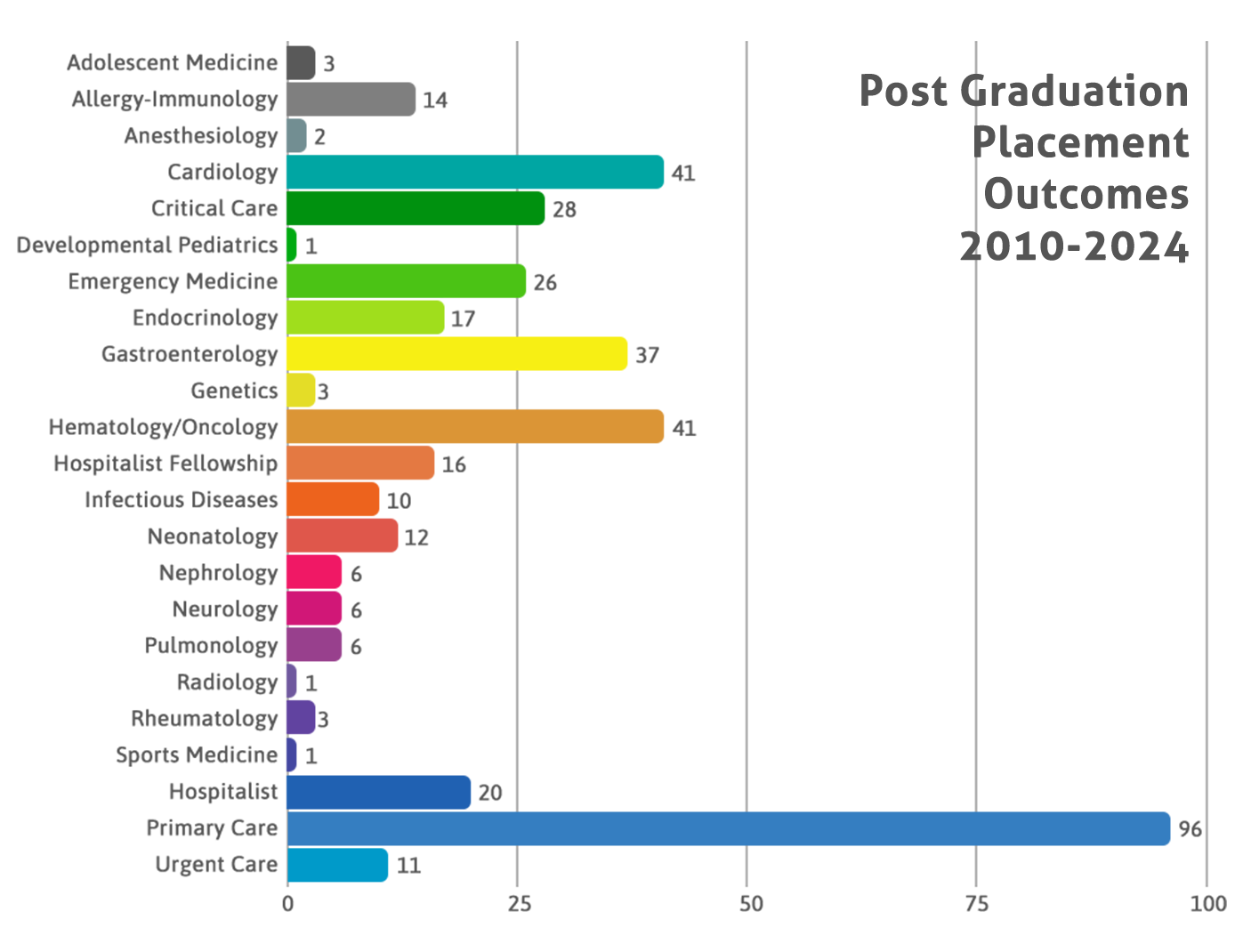 The Pediatric Residency Program is extremely proud of our residents' academic accomplishments. Among these achievements, we recognize our residents' history of successful placements in many of our nation's top fellowship training programs. Over the years, our residents have gone on to pursue fellowships in numerous pediatric subspecialty areas as depicted here and have become leaders in their fields.