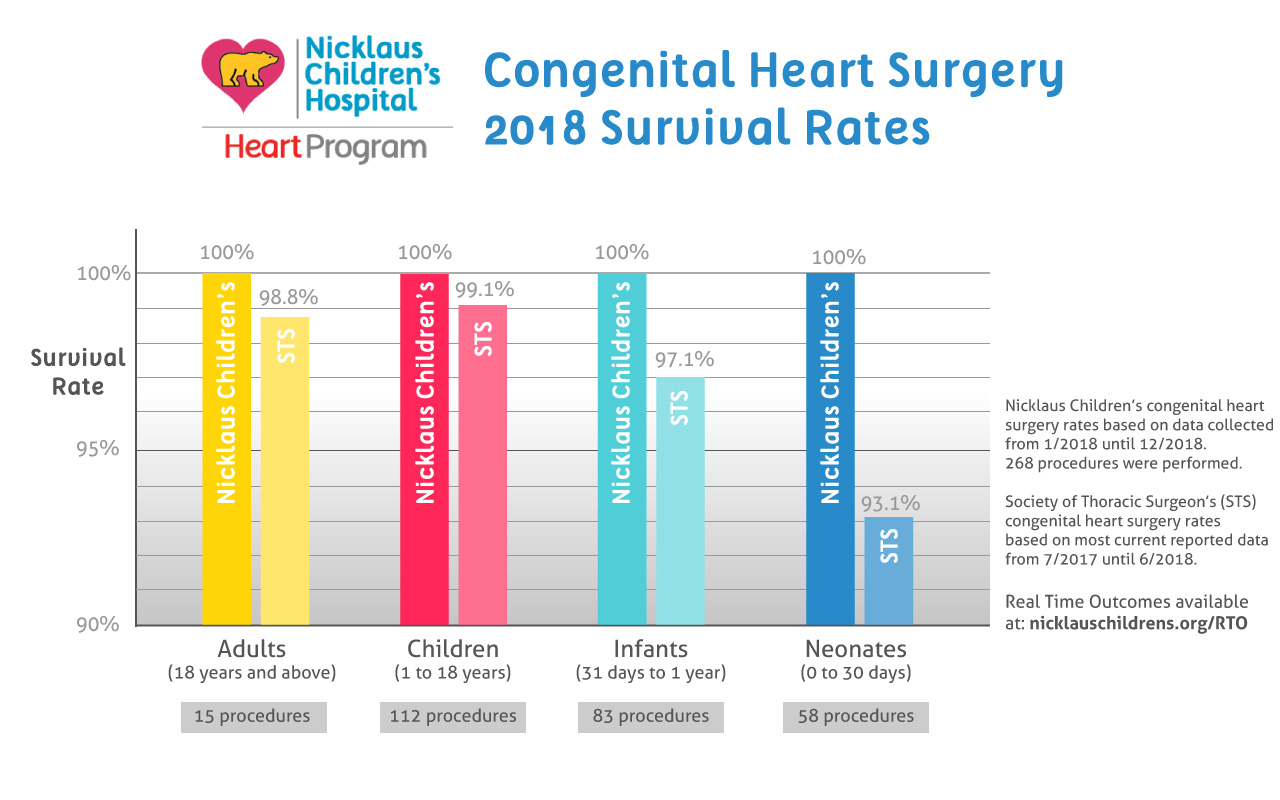 The Heart Institute at Nicklaus Children’s Hospital remains dedicated to providing the very best and safest experience for patients undergoing congenital heart surgery. The program has reported that all 270 children who underwent congenital heart surgery at Nicklaus Children’s in 2018 survived. By contrast, congenital heart surgery mortality reported nationally by the Society of Thoracic Surgeons (STS) averages 3 percent annually. Based on the STS average, about one patient in 33 nationwide who underwent congenital heart surgery did not survive.