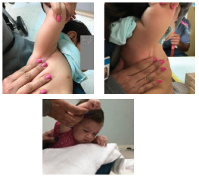 Action: Stabilize shoulder blade with one hand and gradually raise the arm straight up in front of the body and over the top of the head by supporting the arm at the elbow. Hold for a stretch for 5-10 seconds seconds at the point where resistance is felt or just below the point where baby exhibits any pain behaviors.